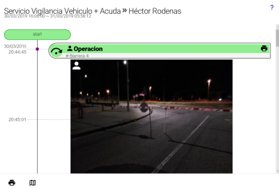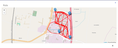 Al seleccionar el icono de mapa, ubicado en la parte inferior izquierda junto al icono de impresión, se desplegará un mapa con todos los desplazamiento que se han producido durante el servicio, en donde aparecerán señalizados los puntos (con el icono de ubicación en azul), donde han ocurrido incidencias, eventos o alarmas.